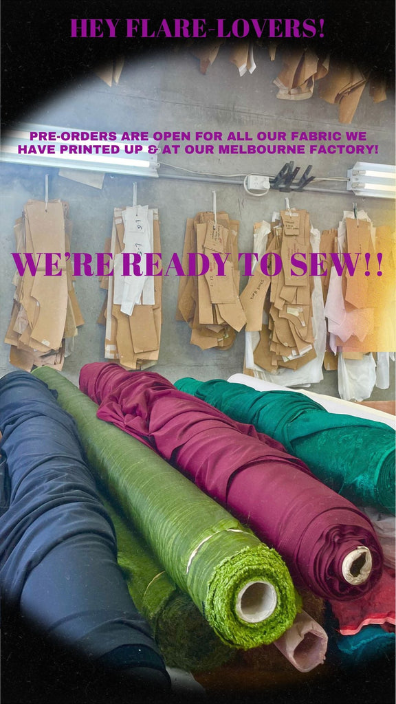 The fabrics have been printed and we're collecting pre-orders for our flare-lovers desired sizes, it means we can manufacture sustainably and make just what is needed!!